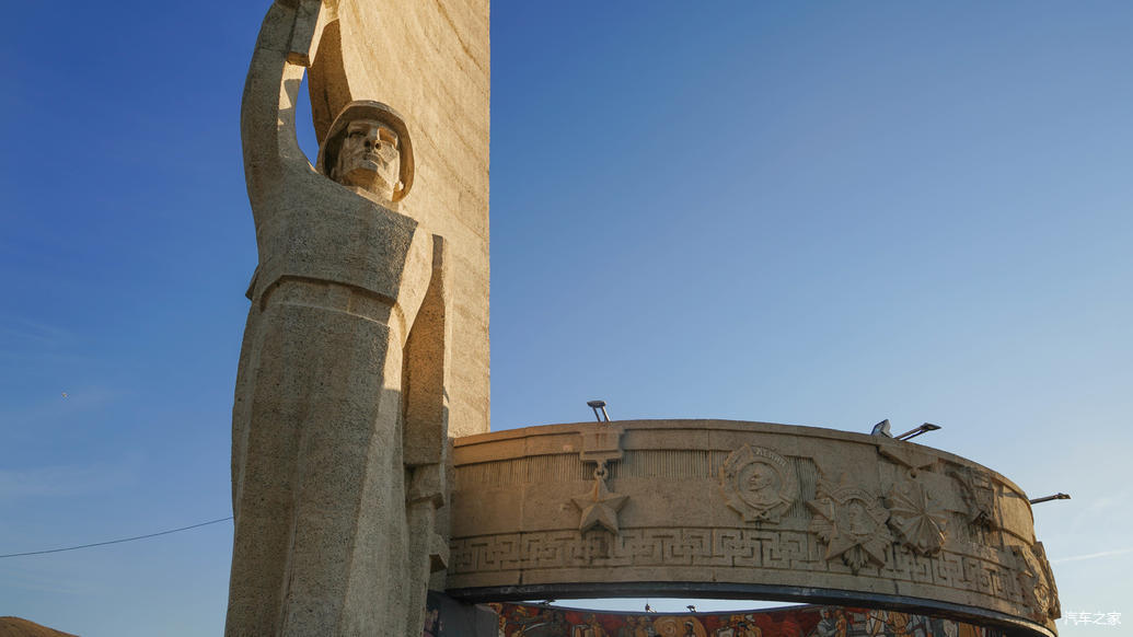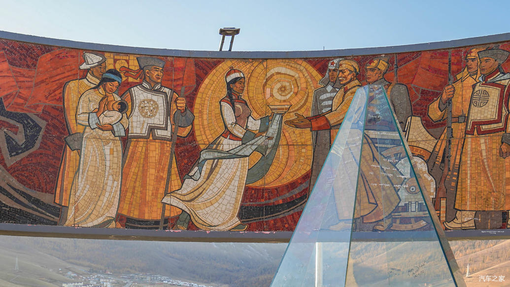 山顶有一个圆形广场,广场上有为二战时牺牲的蒙古国战士建的纪念碑,头顶的环形瓷砖上则是苏维埃支持蒙古国独立的场景。没错,这里就是典型的爱国主义教育基地了。