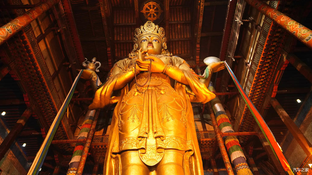 这就是主殿的章冉泽大佛了。我们更熟悉的叫法是“千手观音”。大佛全身镀金,镶嵌大量宝石。可是,现在这尊并非原件,原来的大佛在二战期间运到苏联做了子弹。也真是很传奇了。寺内有转经筒,很多人都会带着虔诚的心在寺内顺时针转上一圈。