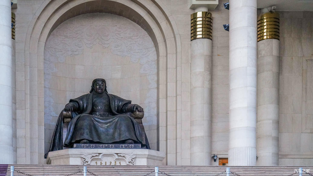 国会大厅前坐的可是成吉思汗!,中部是成吉思汗,左右是儿子窝阔台和孙子忽必烈。说明,在蒙古人的心目中,成吉思汗的地位还是很高的。成吉思汗座像正对的雕像是苏赫巴托尔将军。